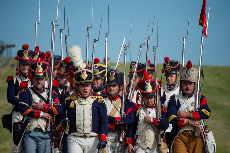 Als Soldaten verkleidete Darsteller ziehen am 17.09.2017 bei Lüben (Niedersachsen) mit ihren Waffen über das Schlachtfeld. Die Schlacht an der Göhrde gegen die Truppen Napoleons fand am 16. September 1813 statt. Alle zwei Jahre wird das Ereignis von dem Museumsverein und der Samtgemeinde Dahlenburg in historischen Kostümen am Originalschauplatz nachgespielt. Foto: Philipp Schulze/dpa +++(c) dpa – Bildfunk+++
