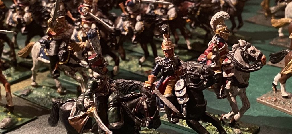 Ney´s Attacke! Hier habe ich mal die französische Kavallerie unter dem Befehl des Marschalls Ney, wiederum mit 28mm-Figuren, dargestellt. Eine imposante Streitmacht. Marschall Ney und sein Adjuadant Heymes. Zurück