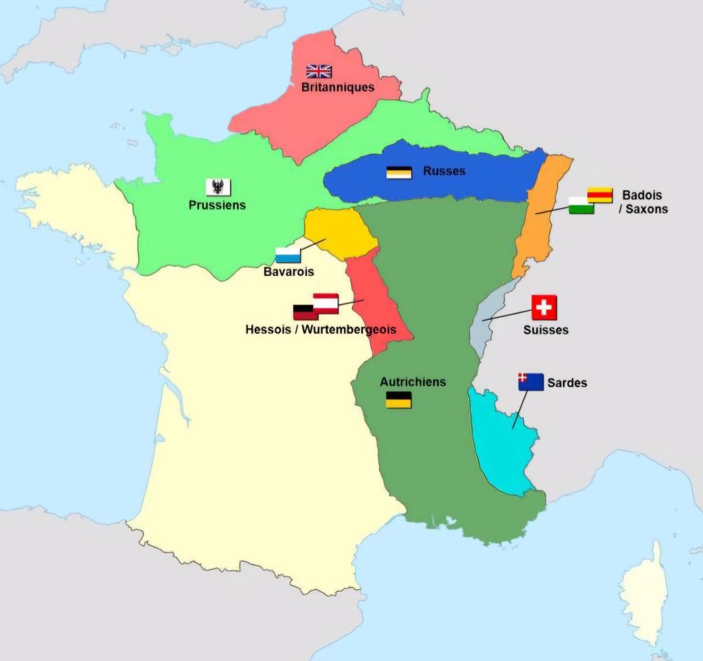 Für Frankreich sollte die Niederlage bei Waterloo noch ein bitteres Ende haben. Nach dem 2. Einmarsch der Alliierten in Paris erfolgte eine Besetzung des Landes auf 3 Jahre bis 1818. Auf der untenstehenden Abbildung sind die Länder dargestellt, die an der Besetzung teilnahmen. Darunter auch Länder des ehemaligen Rheinbundes.