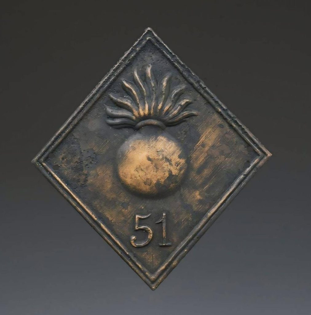 128ème de Ligne, Modell 1812. Nach königlicher Anweisung von 1814 wurde der imperiale Adler abgebrochen. Offensichtlich wurde das Blech nach Rückkehr der Bourbonen noch getragen, obwohl dass Regiment bereits 1813 aufgelöst wurde. Die Reste der 128ème wurden auf das 127ème überführt.